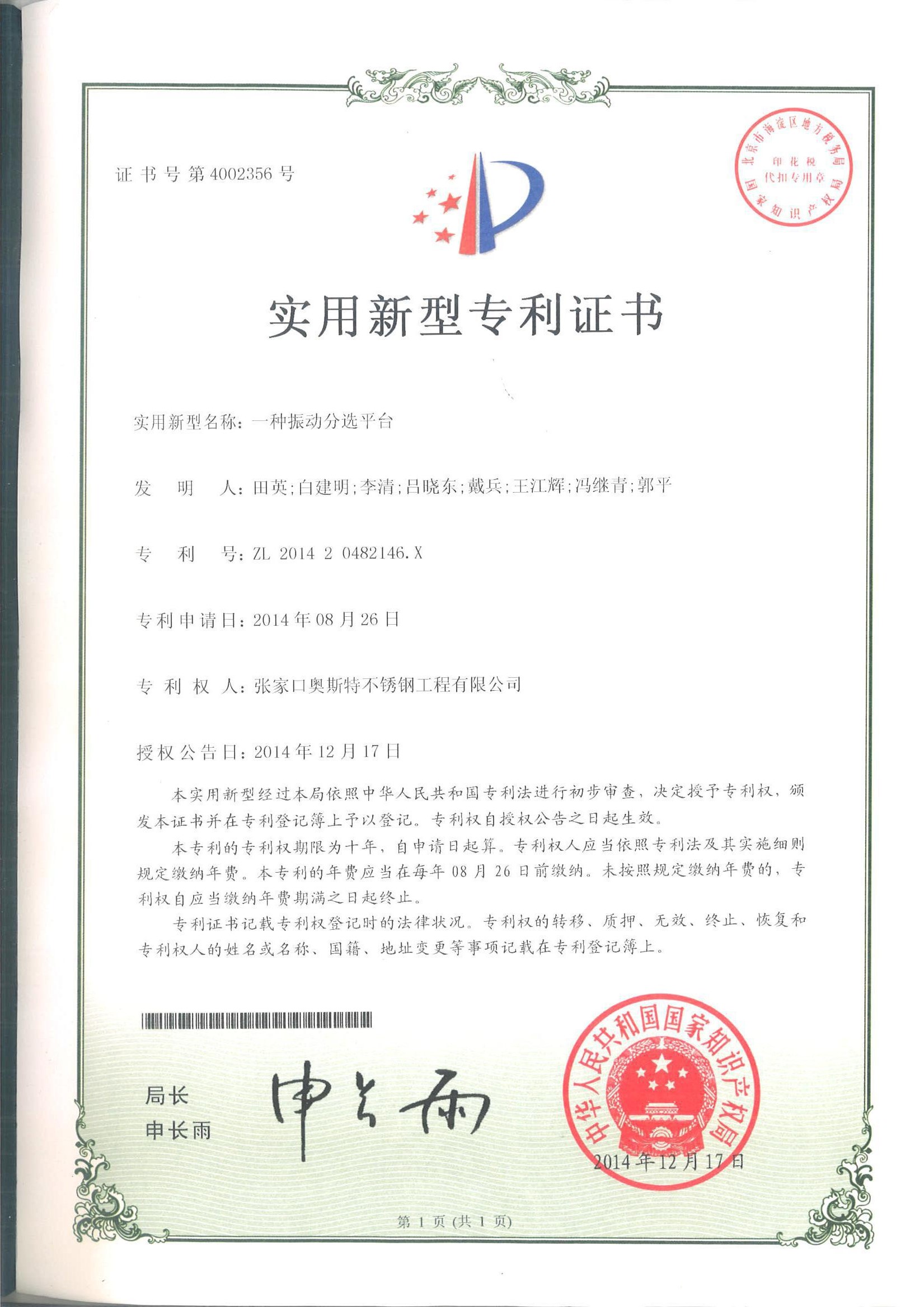 热烈庆祝张家口奥斯特不锈钢工程有限公司获得《一种振动分选平台》等11项实用新型专利!